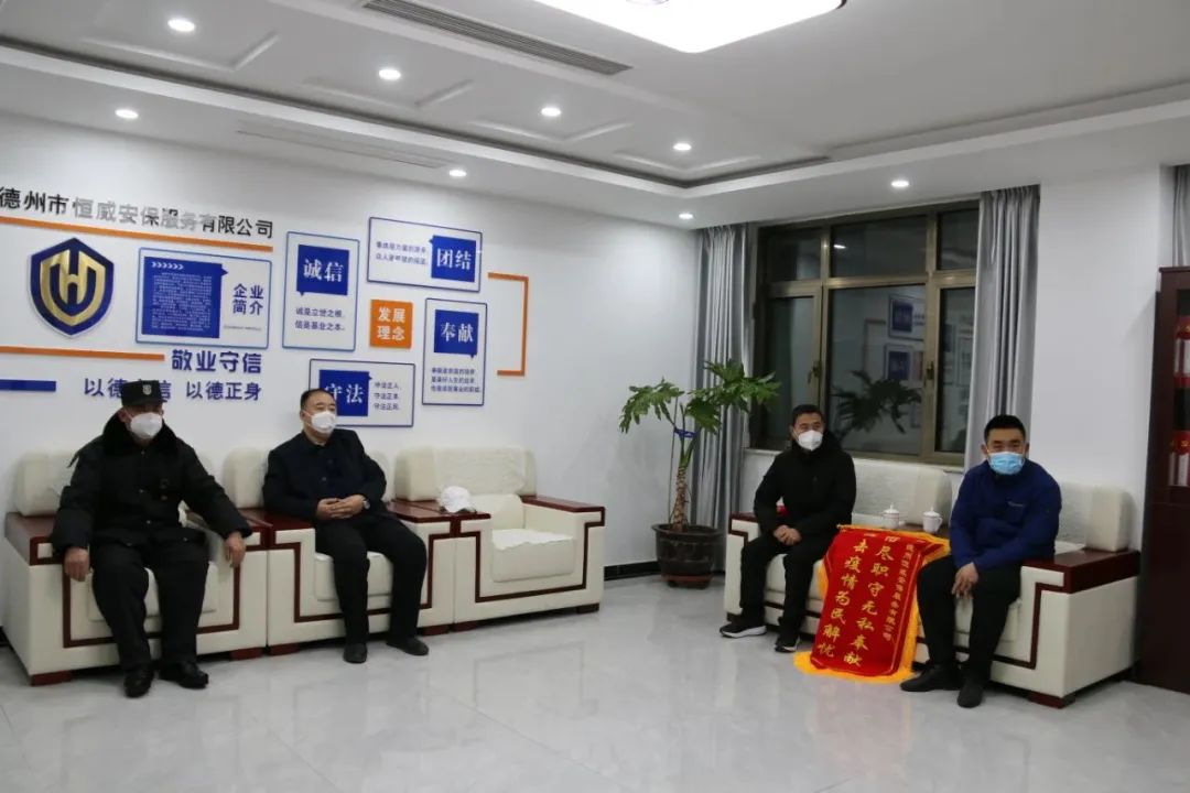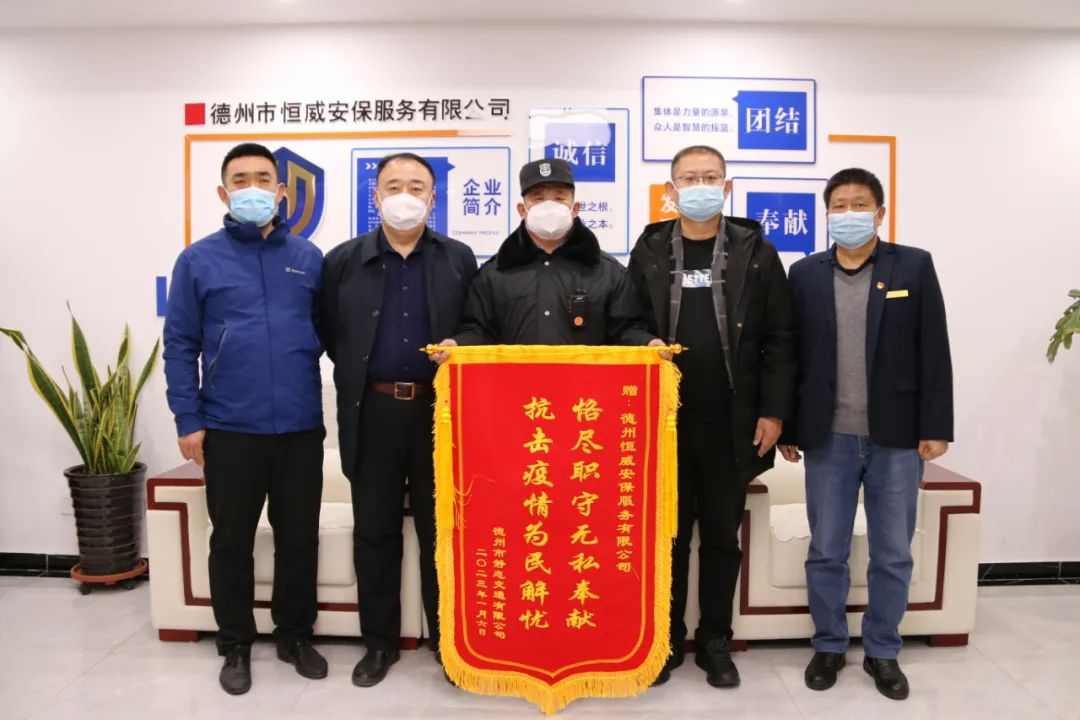 1月13日,德州市靜態(tài)交通有限公司呂強(qiáng)主任一行三人到訪(fǎng)德州市恒威安保有限公司,將寫(xiě)有“恪盡職守?zé)o私奉獻(xiàn) 抗擊疫情為民解憂(yōu)”錦旗交予恒威安保手中,公司副總經(jīng)理張玉濤、張有利,七公司大隊(duì)長(zhǎng)高榮海參與接待。
