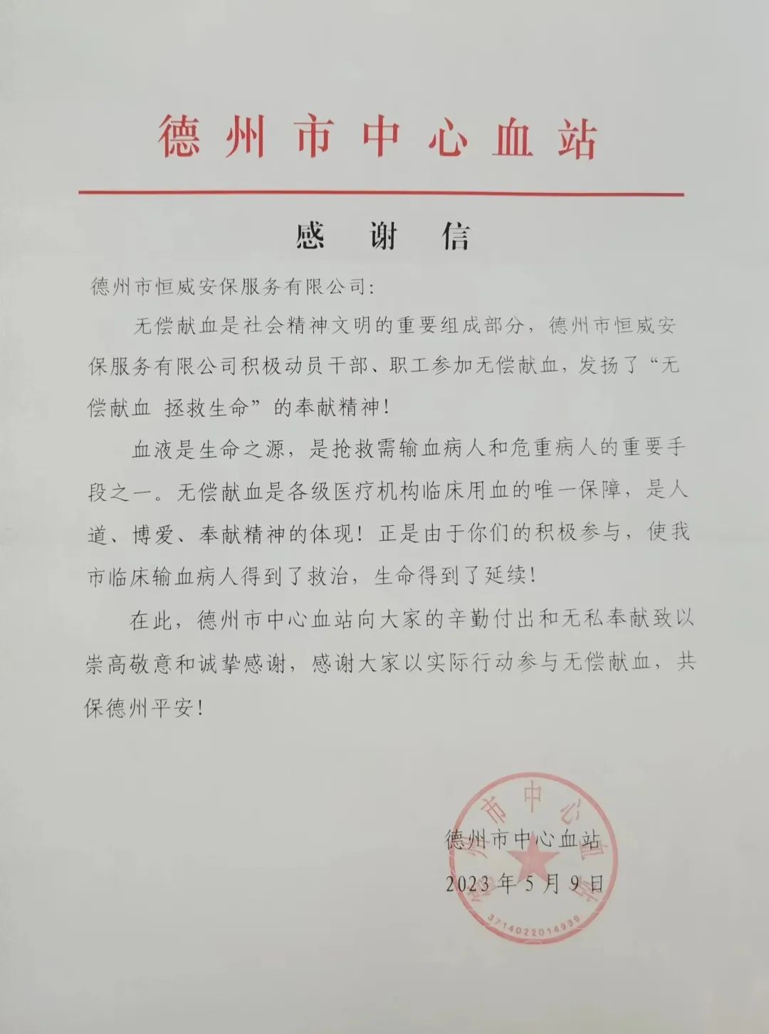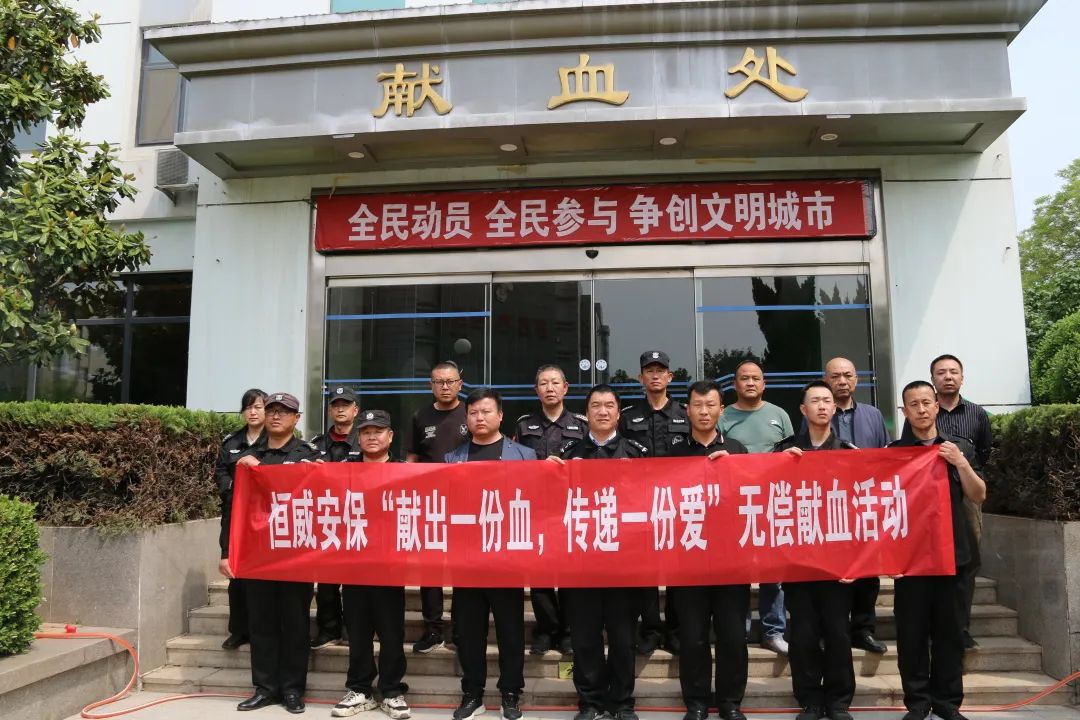5月9日,德州市恒威安保服務(wù)有限公司組織開(kāi)展“獻(xiàn)出一份血,傳遞一份愛(ài)”無(wú)償獻(xiàn)血活動(dòng),以實(shí)際行動(dòng)支持無(wú)償獻(xiàn)血活動(dòng)。