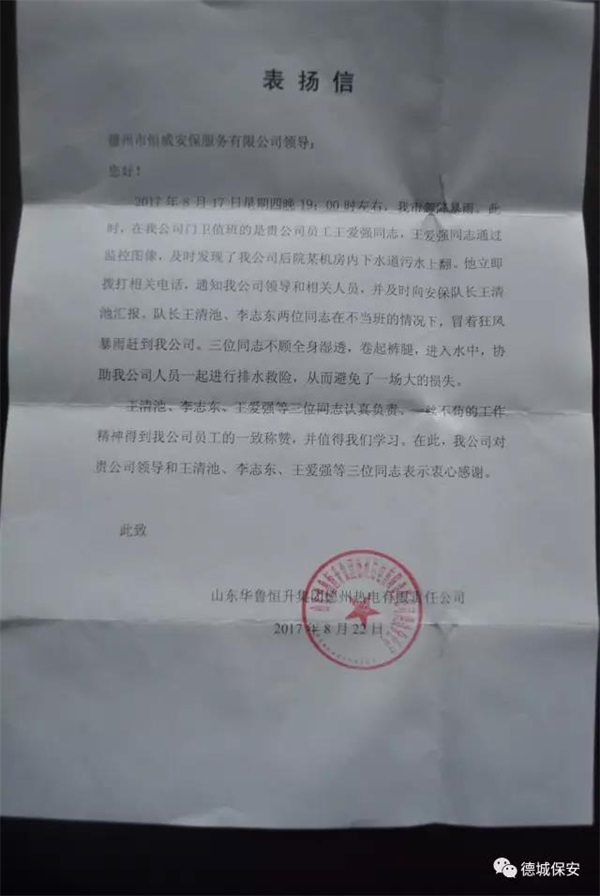 經了解,2017年8月17日晚19時許,我市突降暴雨。人防二大隊六中隊派駐山東華魯恒升集團德州熱電有限責任公司保安隊員王愛強在監(jiān)控視頻畫面中,及時發(fā)現(xiàn)客戶單位后院機房內下水道污水上翻,且發(fā)電機組正在運行,情況危急。他立即撥打了相關電話,通知客戶單位領導和相關人員切斷電源,并通知已下班的保安班長王清池和李志東。王清池、李志東兩名同志正在家中休息,聽到情況后,冒著大雨趕到單位,和王愛強一起卷起褲腿、進入齊腰深的水中,協(xié)助客戶單位搶險人員一起排水搶險,成功避免一場重大損失。恒升德州熱電領導得知此事后,高度重視,要求相關領導親自到恒威公司感謝相關搶險人員,也為保安隊員認真負責、愛崗敬業(yè)的作風表示欽佩。同時對恒威公司能培養(yǎng)作風過硬的保安隊員和提供的優(yōu)良、好的效率率的安保服務表示認同和贊揚。