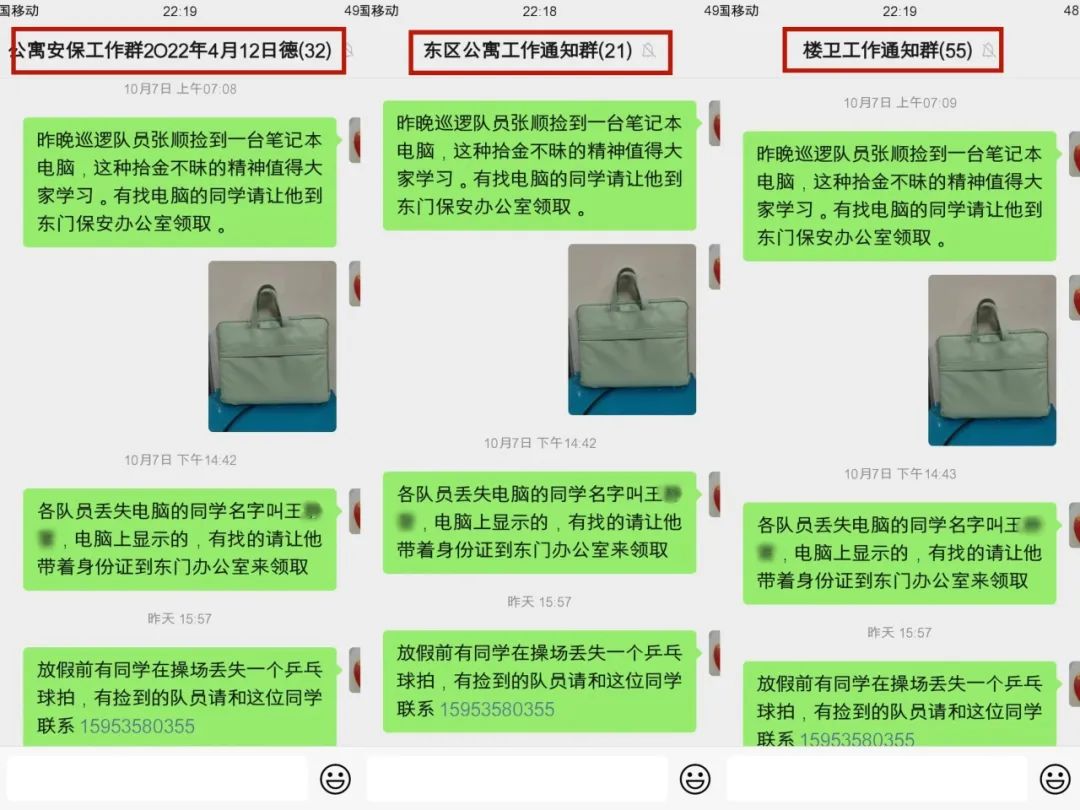 10月6日晚上,恒威安保駐德州學院班組保安員張順在校園例行巡邏過程中,在路過14號公寓時,看到一輛共享單車車把上掛著一個藍色辦公包,里面裝有筆記本電腦等物品,疑似被人遺忘在車上。張順擔心失主發(fā)現(xiàn)東西丟失后返回尋找,便在原地等待了半個小時,但失主遲遲未出現(xiàn),張順便將現(xiàn)場情況向隊長劉明剛報告,并將電腦包移交校園警務室,同時在工作群中發(fā)布失物招領信息。
