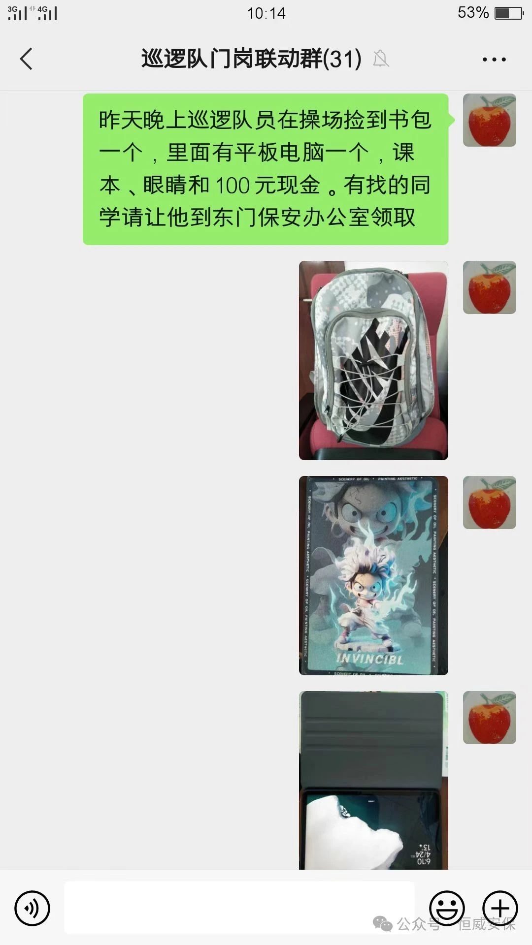 4月24日晚20時(shí)左右,恒威安保駐德州學(xué)院執(zhí)勤班隊(duì)員王順元,在學(xué)校操場(chǎng)巡邏時(shí),發(fā)現(xiàn)操場(chǎng)邊遺落一背包。詢問(wèn)周邊人員,均不是失主。經(jīng)查看背包里面有一個(gè)平板電腦、眼鏡等物品,無(wú)法與失主直接取得聯(lián)系,隨即將背包帶回值班室,并在微信工作群中發(fā)布失物招領(lǐng)信息。第二天上午,失主陳同學(xué)得知消息后來(lái)到值班室認(rèn)領(lǐng)背包,值班人員經(jīng)核實(shí)確認(rèn)后將背包歸還陳同學(xué)。陳同學(xué)激動(dòng)地表示,“太感謝王師傅了,昨天發(fā)現(xiàn)背包丟了,擔(dān)心了一晚上,今早晨得知保安師傅撿到了背包,一大早就來(lái)到值班室領(lǐng)取,包里物品完好無(wú)損,真是太感動(dòng)了!”