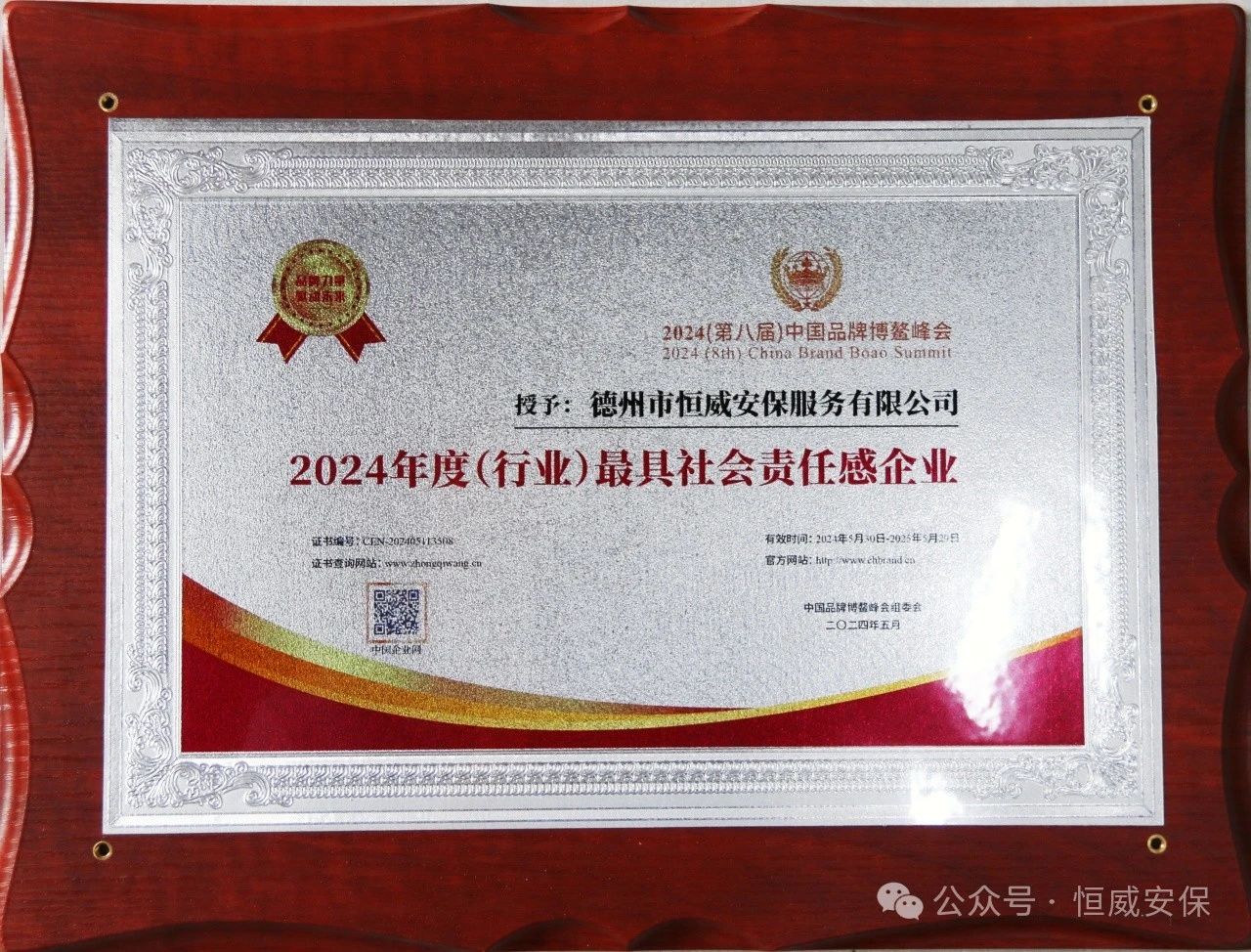 安全守護(hù)與社會(huì)責(zé)任并重|德州恒威安保榮獲中國(guó)品牌博鰲峰會(huì)“2024年度最具社會(huì)責(zé)任感企業(yè)”稱號(hào)
