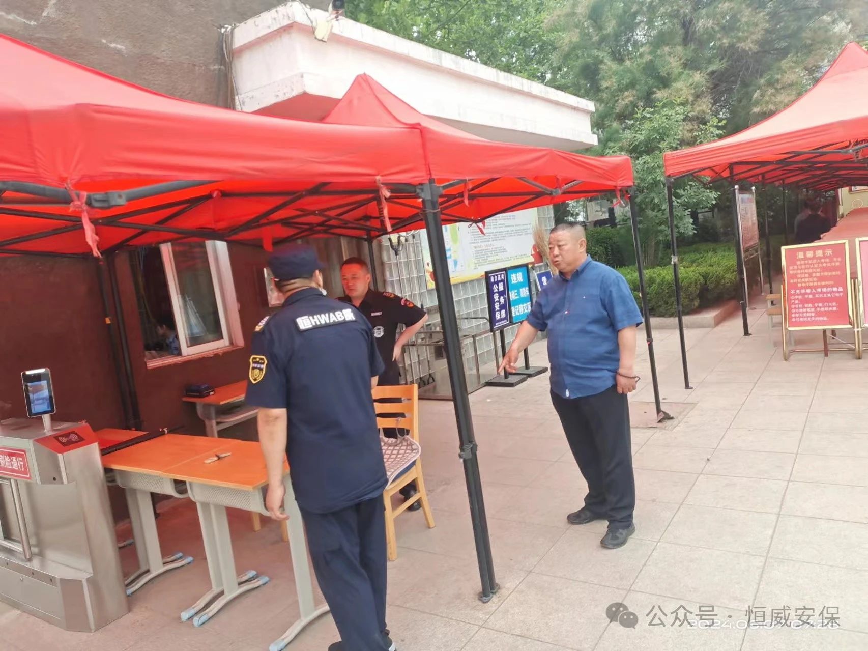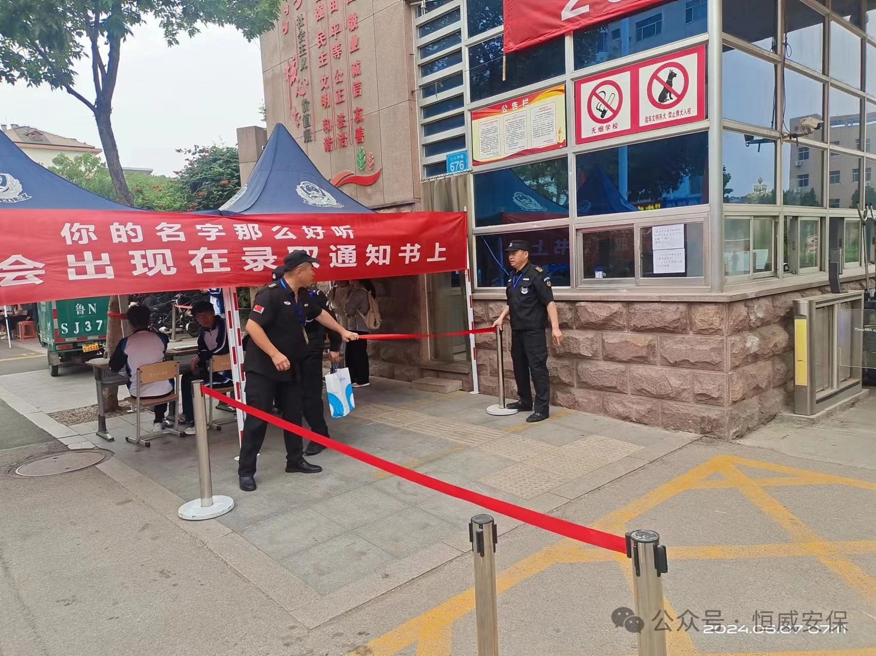 高考首日,各考點執(zhí)勤班組保安員按要求提早一小時到達指定崗位,副總經(jīng)理高印東、董光鵬現(xiàn)場督戰(zhàn),中隊負(fù)責(zé)人賈義軍、侯佃榮、師傳義靠前指揮,嚴(yán)陣以待,從嚴(yán)從細(xì)抓實護校護考,維護考生入(離)場高峰期間門崗秩序,切實保障高考期間秩序平穩(wěn)。